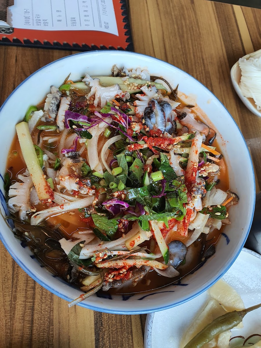We came by for lunch after receiving a recommendation from a friend. This place is easy to find and lots of parking space available. Upon reaching, you have to write on a board, the number of people you have and what your order is. This speeds up the process and upon getting your seat, your food will be served. We ordered 3 servings of Sea Snail Noodles 보말갈국수 (KRW9,000 each) and 1 serving of Sea Snail Porridge 보말죽 (KRW14,000). The noodles come in a wok-like pan over a fire and upon finishing the noodles, they can add rice (KRW3,000 each) to the remaining soup and it becomes a tasty mix. A minimum of 2 servings is required for the noodle and rice. The food was very tasty and the side dishes can be refilled self-service. Sea snail 보말 ('Bomal') is famous in Jeju and a must-try if you visit! This place is neat and very well-serviced. I would come back again for sure!